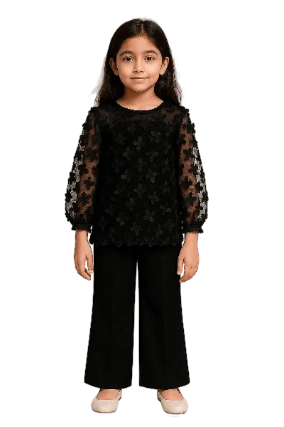 3D Flowers Net Western Top with Silk Flapper Trouser – Black