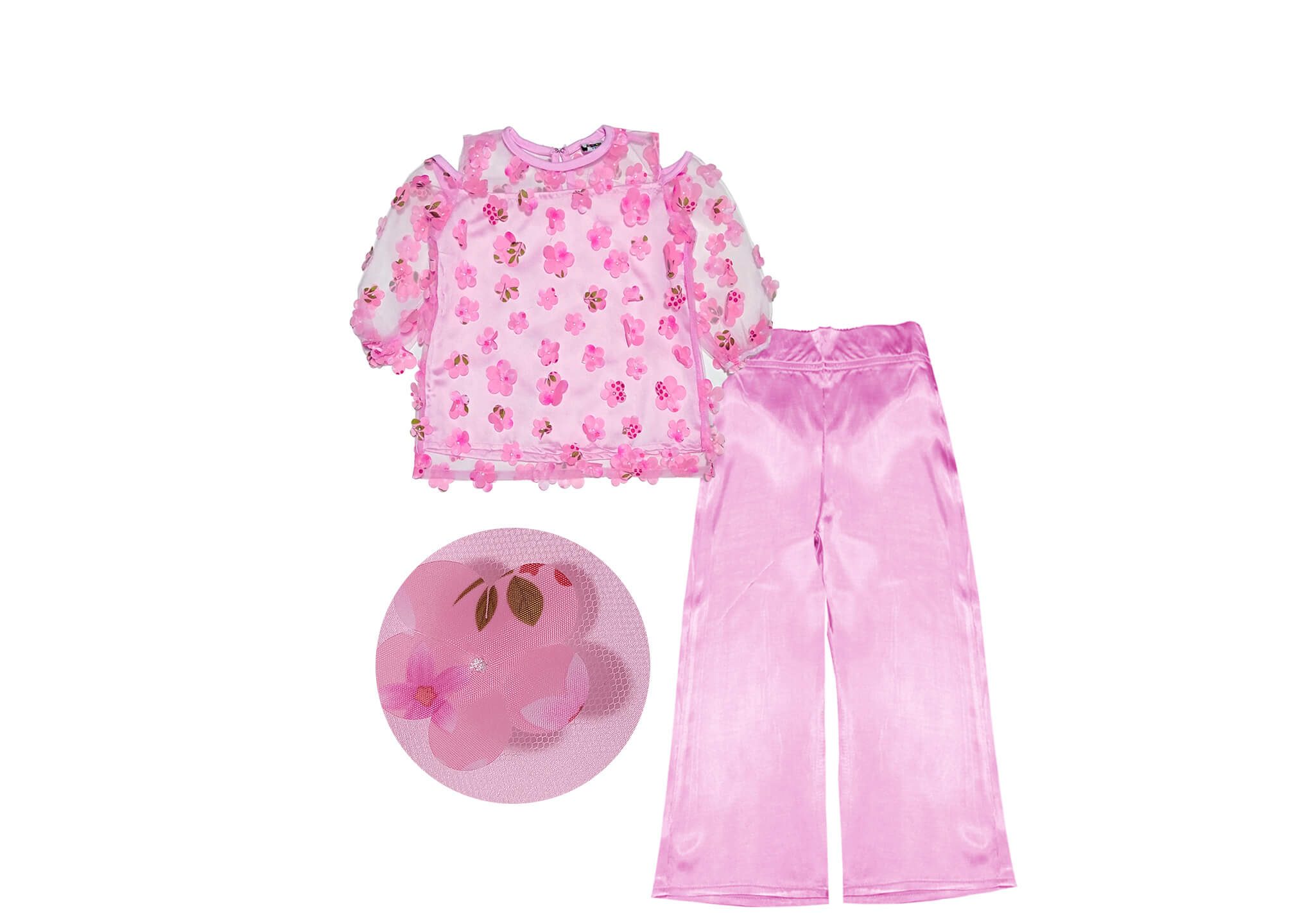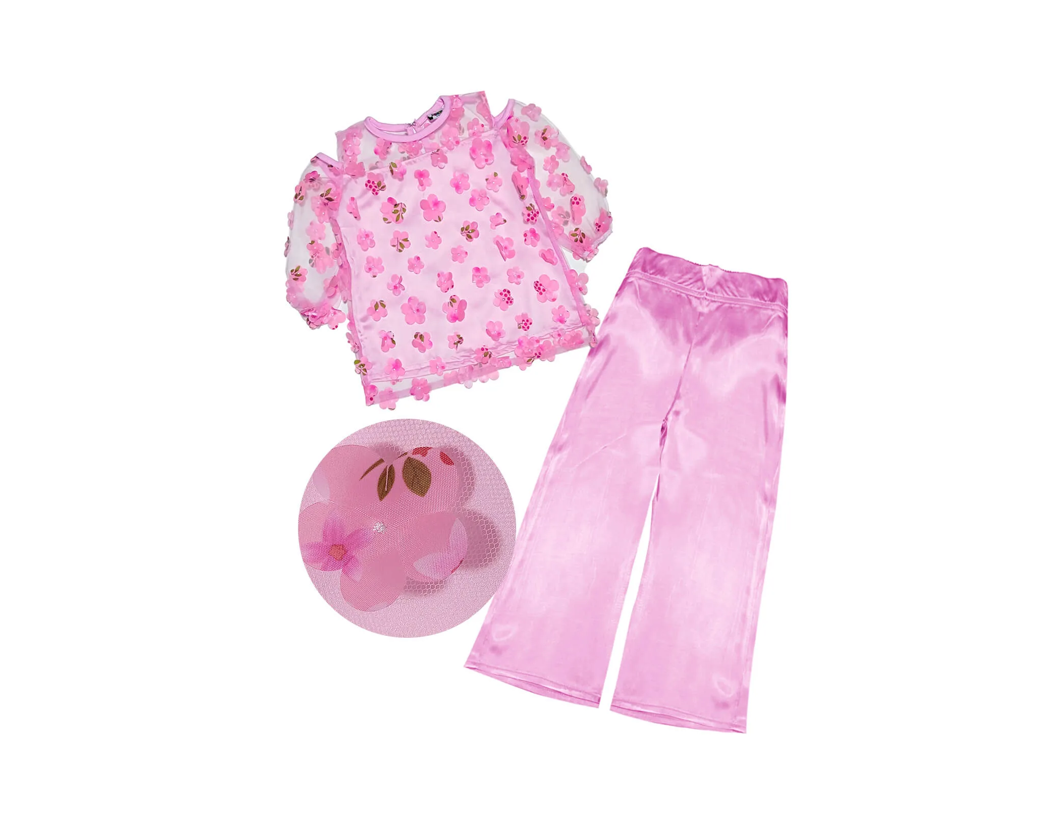 3D Printed Cherry Blossom Net Top with Flare Silk Trouser – Pink