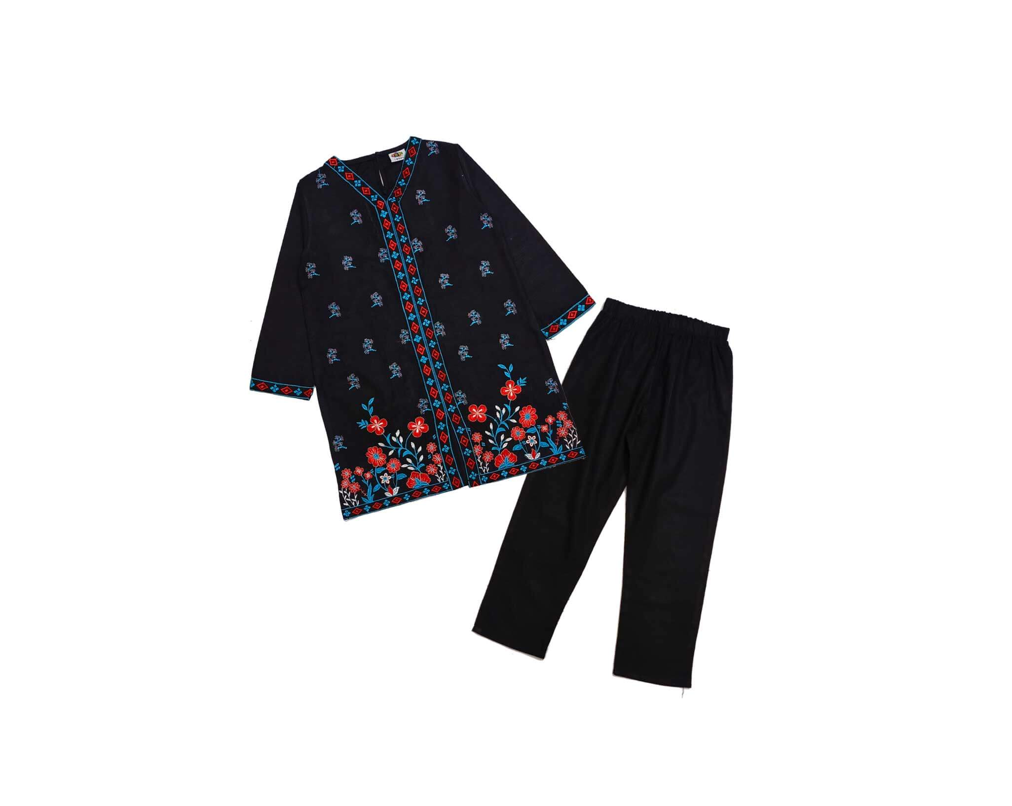This two-piece khuddar is perfect for summer days. Goun Style Florals Emb & Tilla Work Khuddar Shirt with Trouser – Black