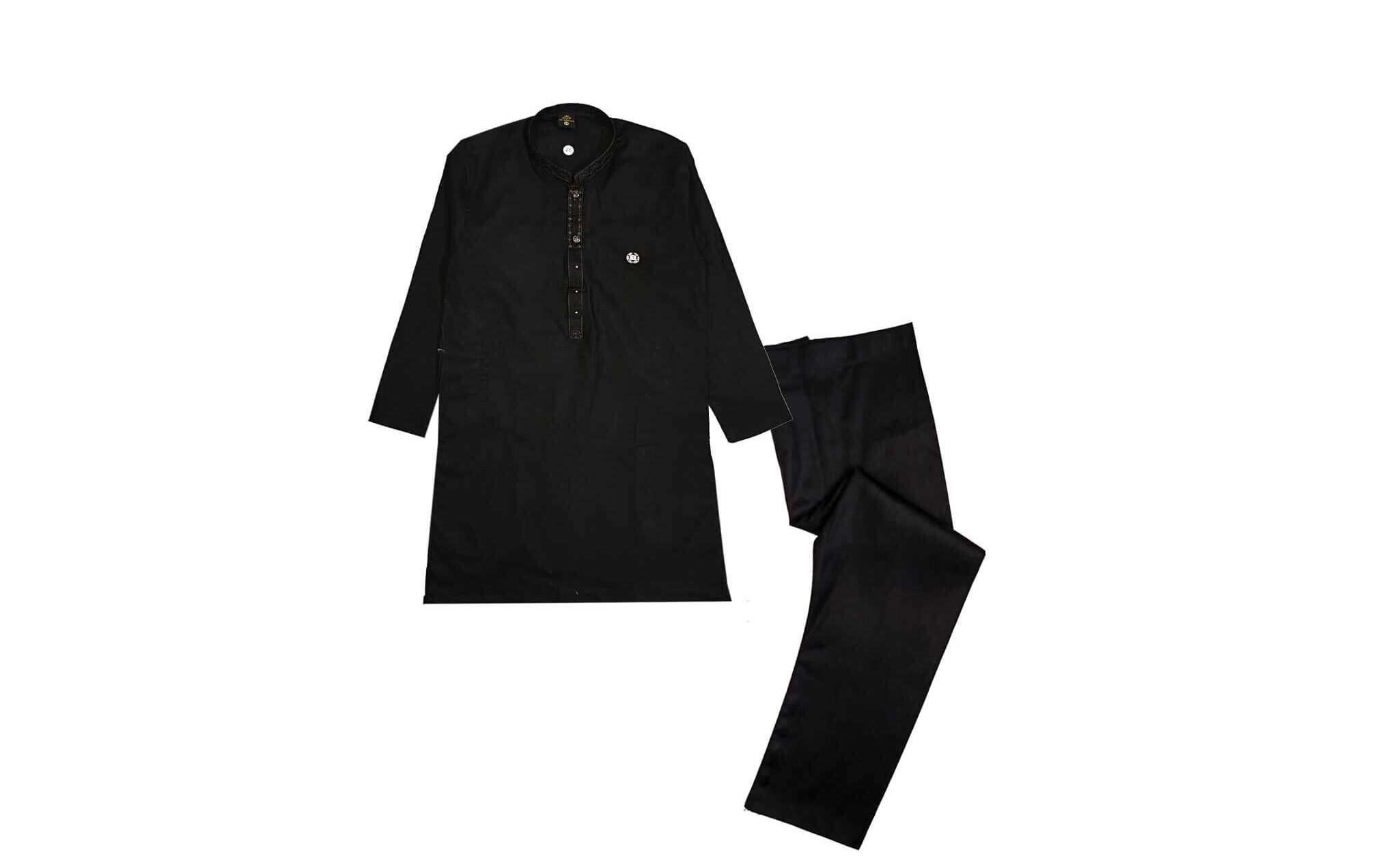 This is a traditional Shalwar Kameez set in a beautiful emerald black color designed for men. The set includes a matching shirt (kameez) and trousers (shalwar).