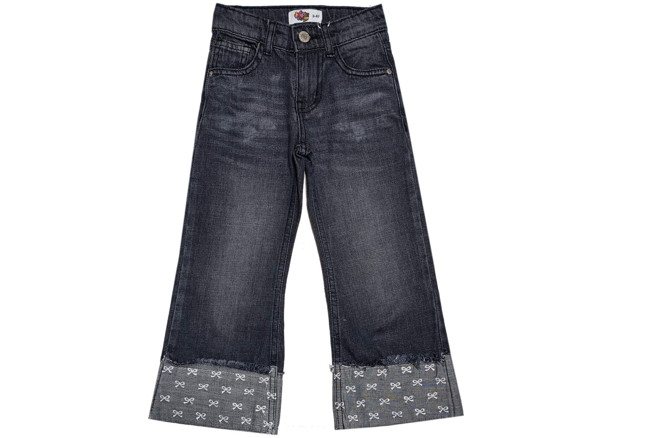 Folding Bottom White Bows wide Leg Denim Pant -Charcoal