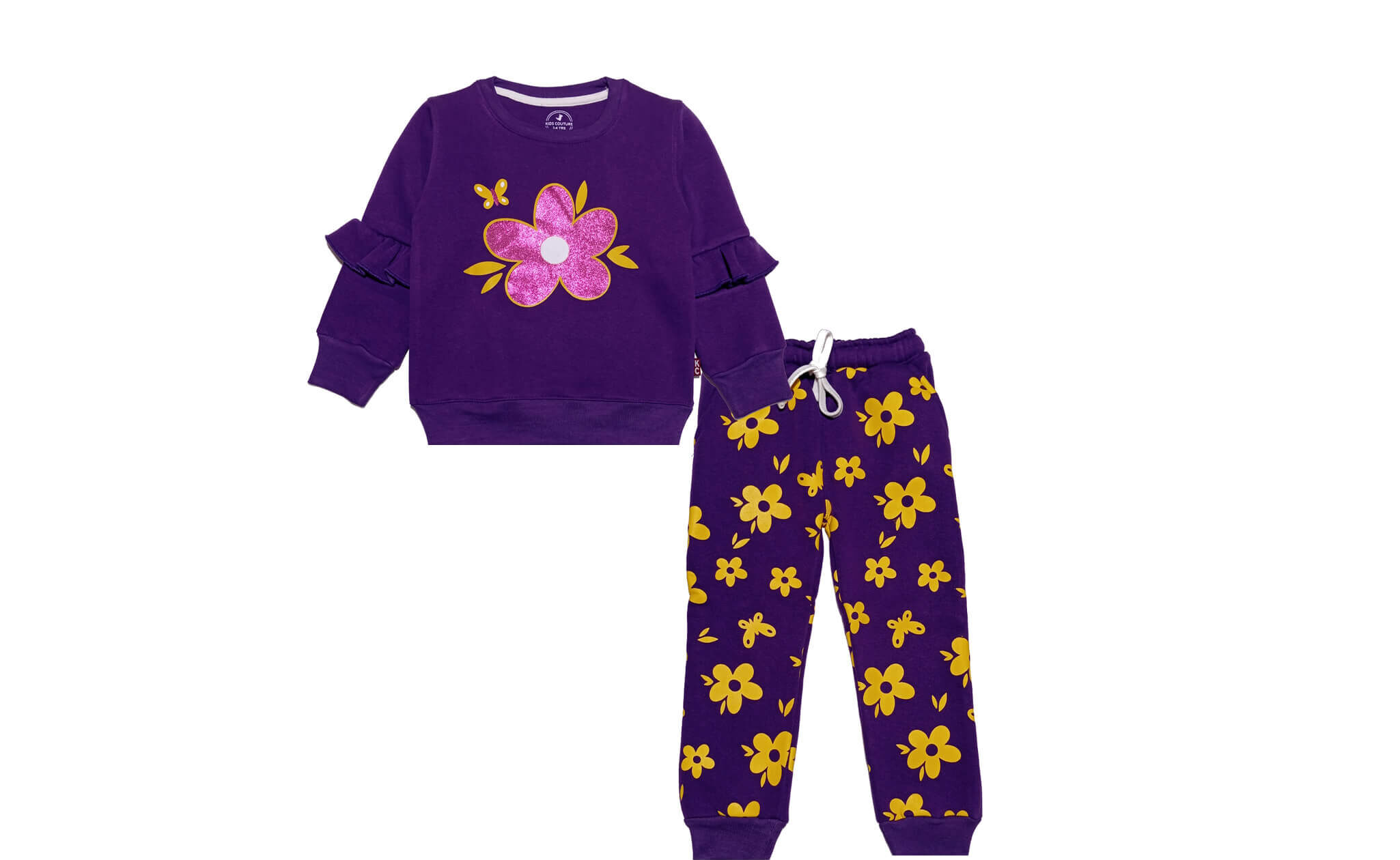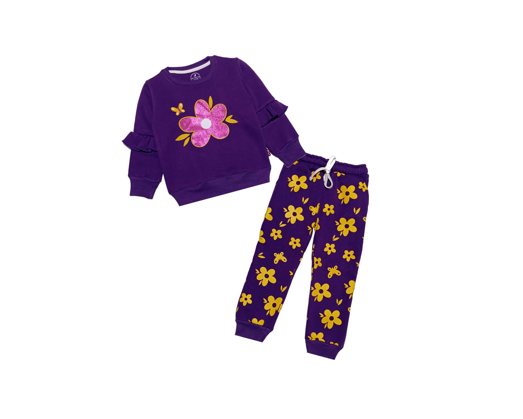 Glitter Flowers Frill Sleeves Fleece Tracksuit – Purple