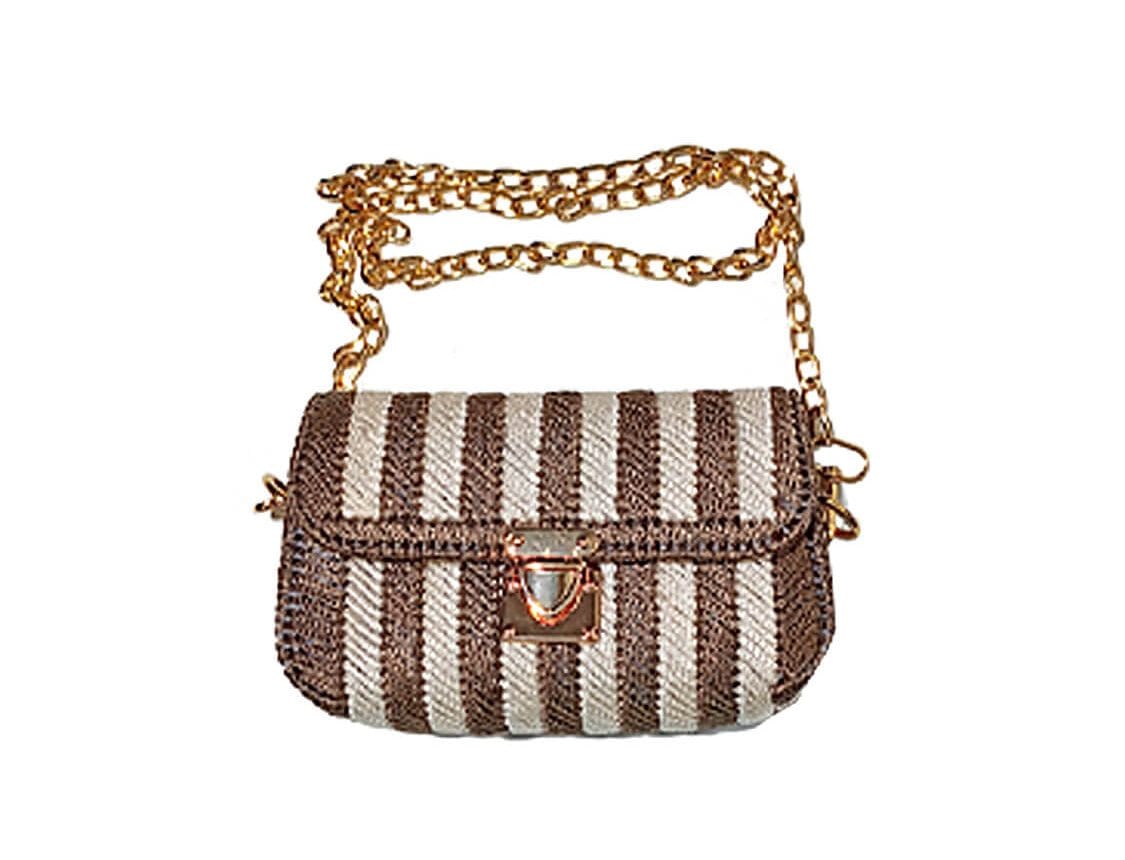 The image displays a small handbag featuring vertical stripes in alternating shades of brown and off-white or beige. The bag has a flap closure secured by a gold-toned clasp, and it is equipped with a long, golden chain strap. The material appears to be woven or knitted, giving it a textured look.