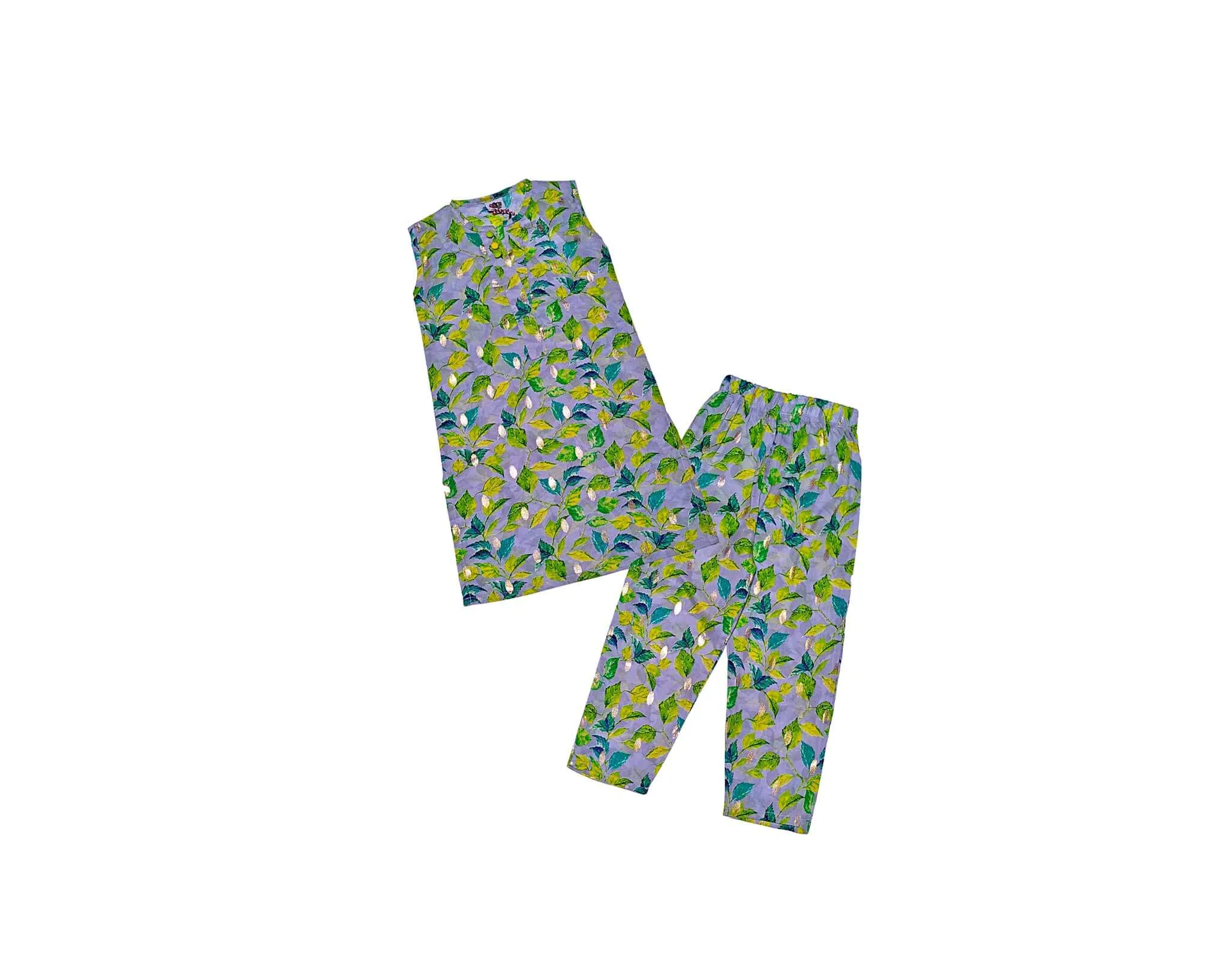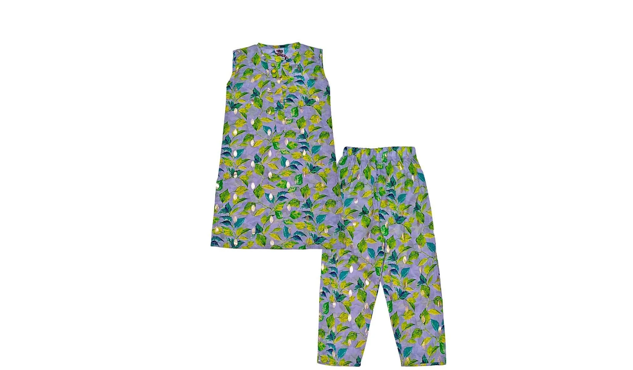 Lemon Leaves Sleeveless Lawn Fabric Kurti & Trouser -Light Grey
