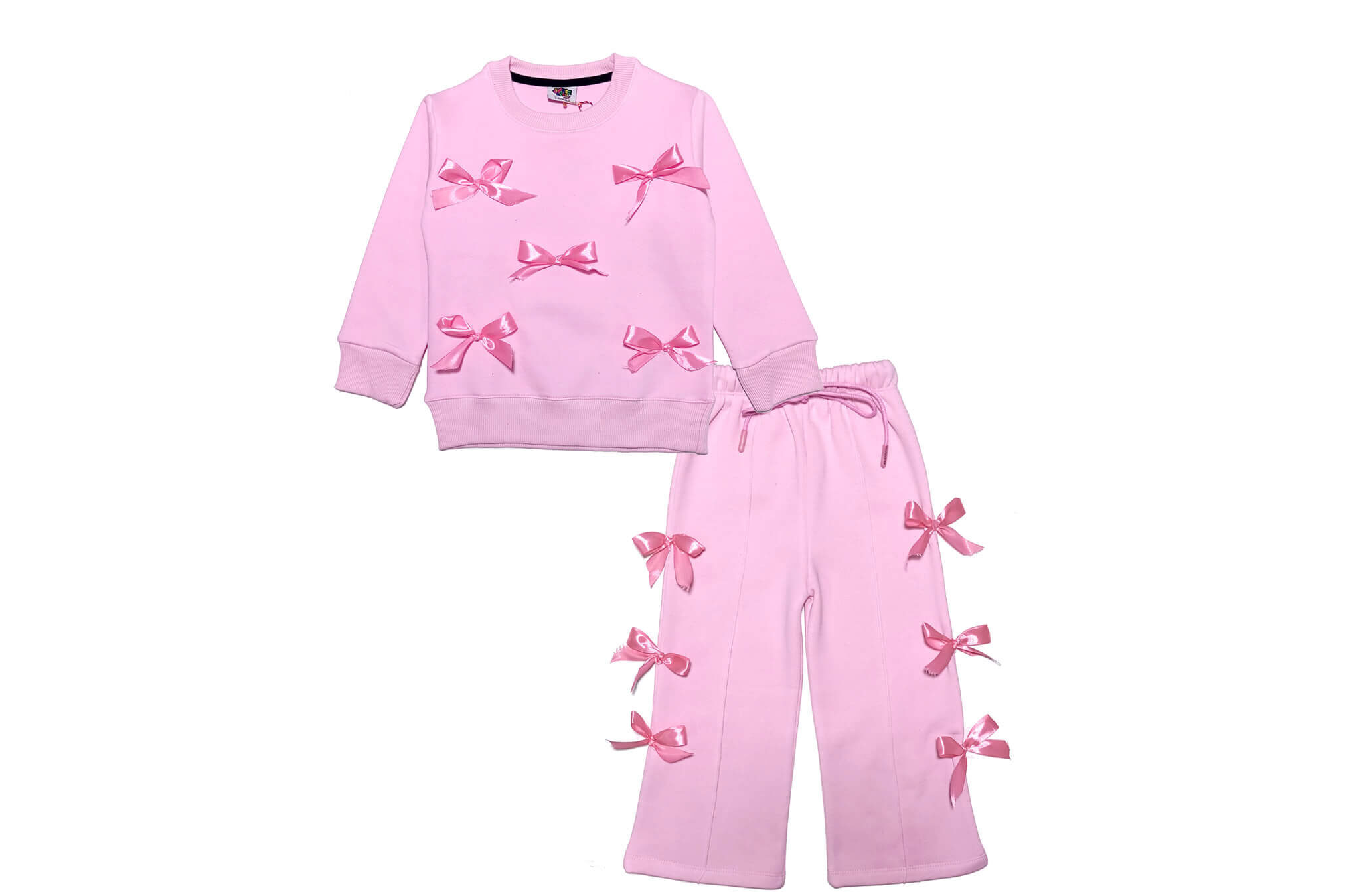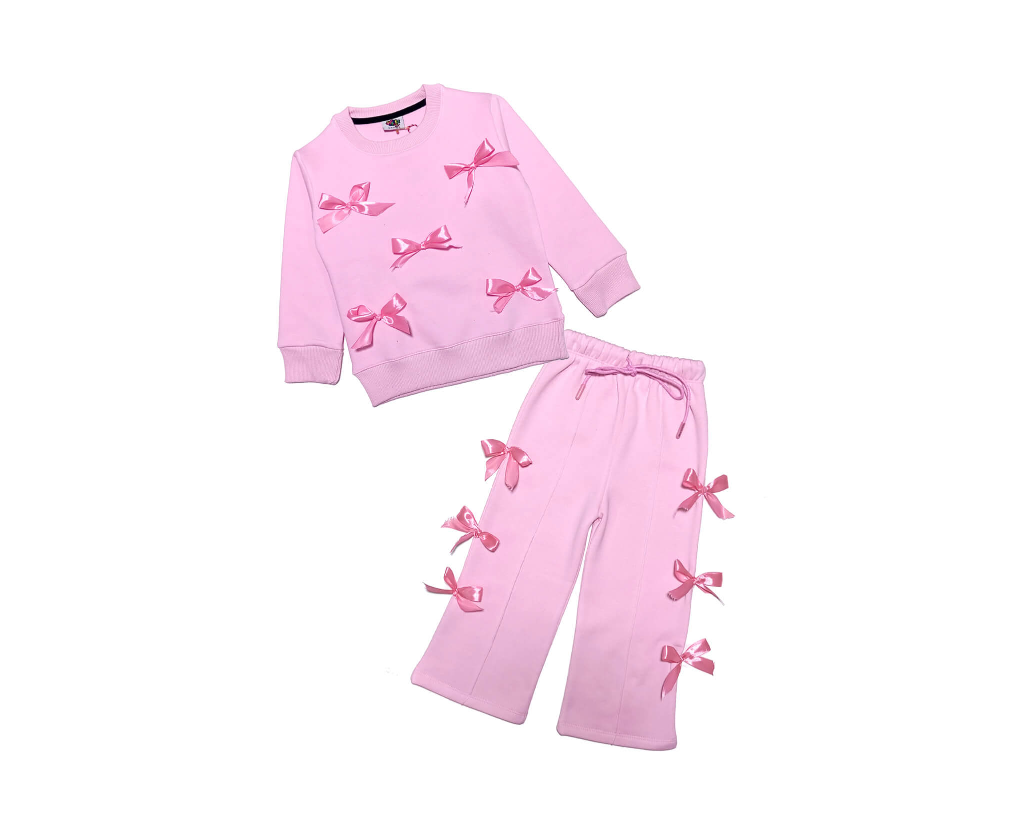 Pink Ribbon Stylish Bow Fleece Sweat with Flare Trouser – Baby Pink