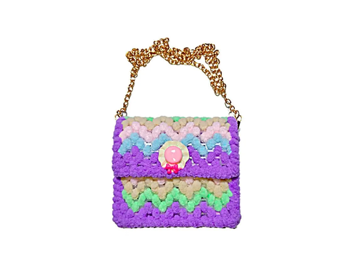 The image displays a small, rectangular handbag with a gold-toned chain strap and a gold-toned clasp closure on the front flap. The body of the bag features a textured, possibly knitted or crocheted, material with a chevron or zigzag pattern in pastel shades of purple, blue, green, and beige