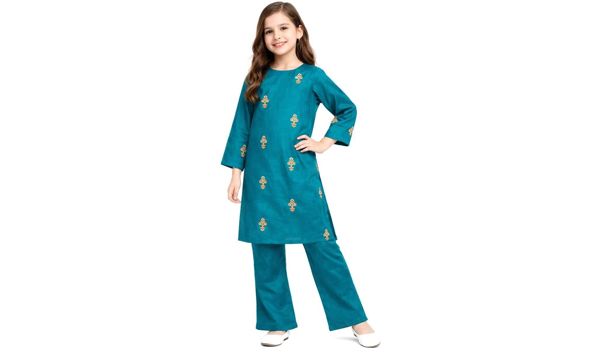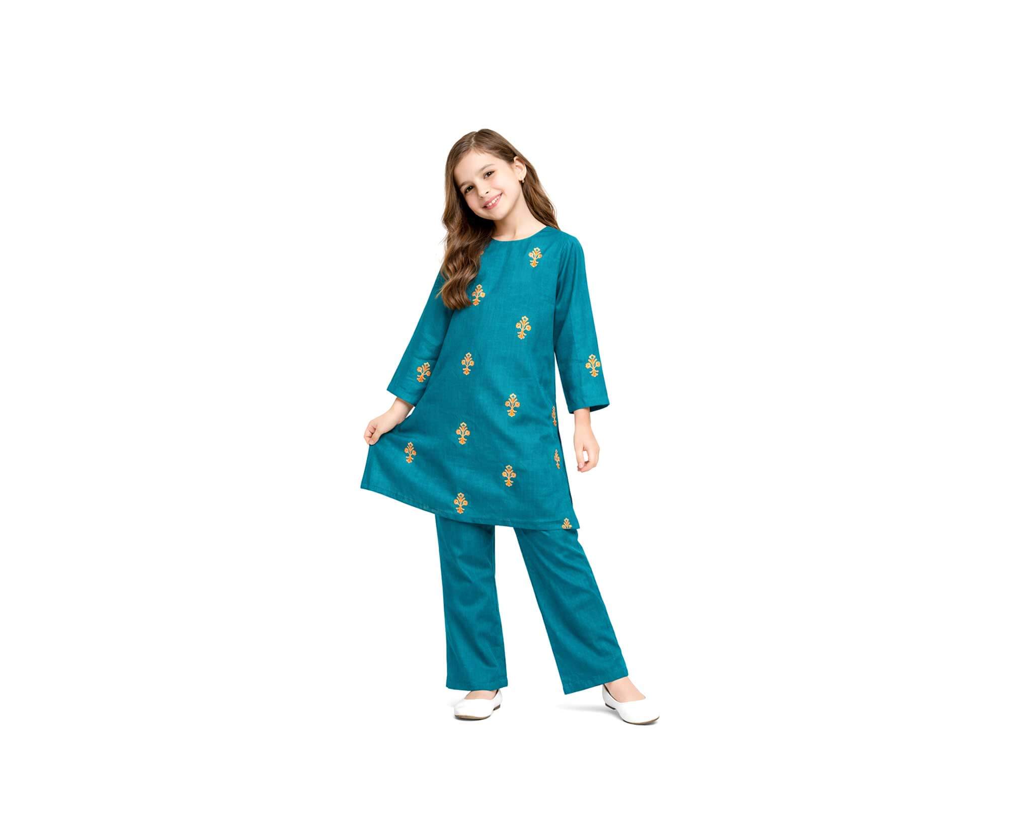 This two-piece ( shalwar kameez / qameez ) girls Khaddar Suit perfect for partywear. Sharp and brilliant colors to give your kids a bright look.