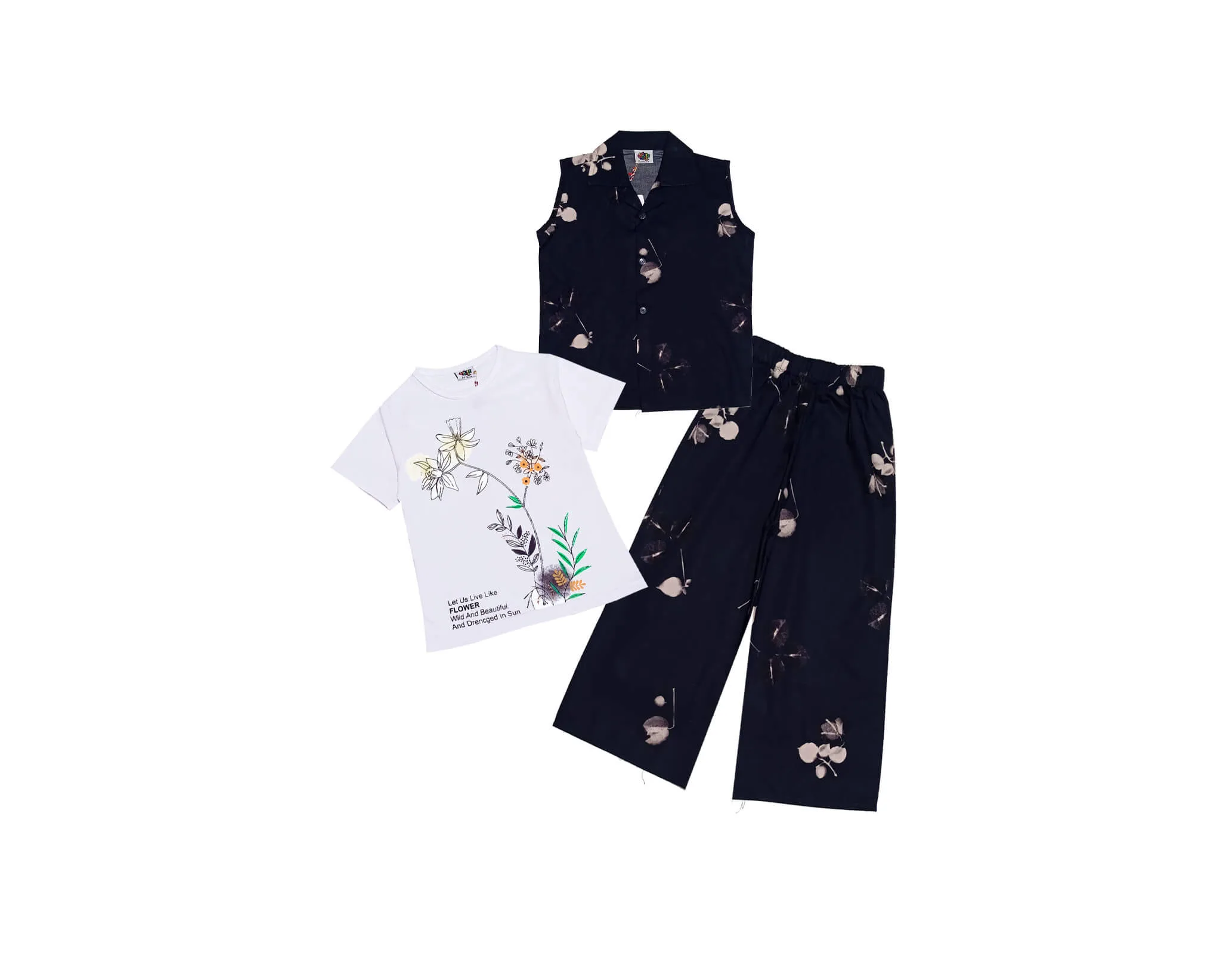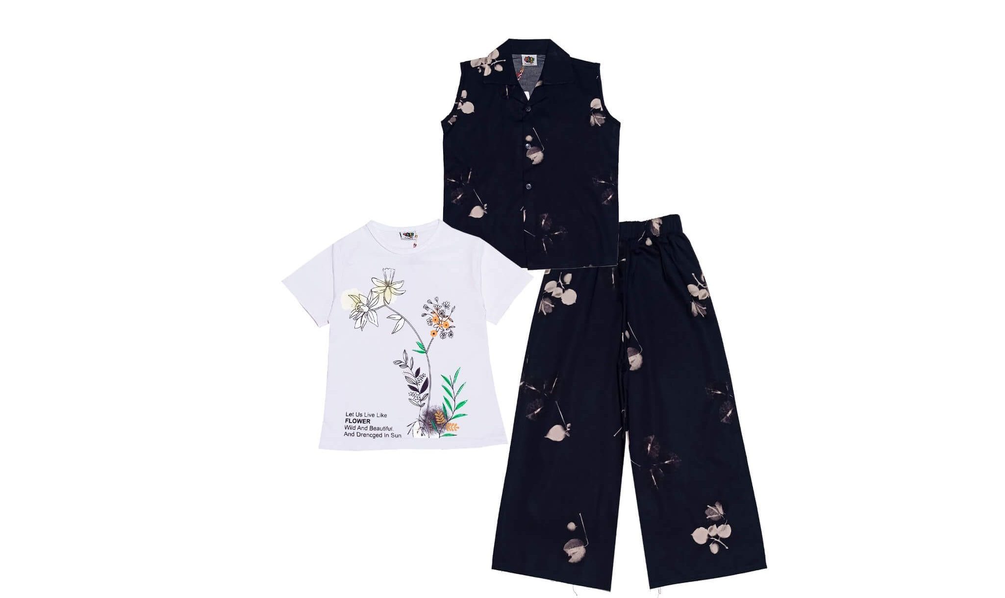 Wild Flowers Cotton Sleeves less Coat Tee & Plazzo -Black